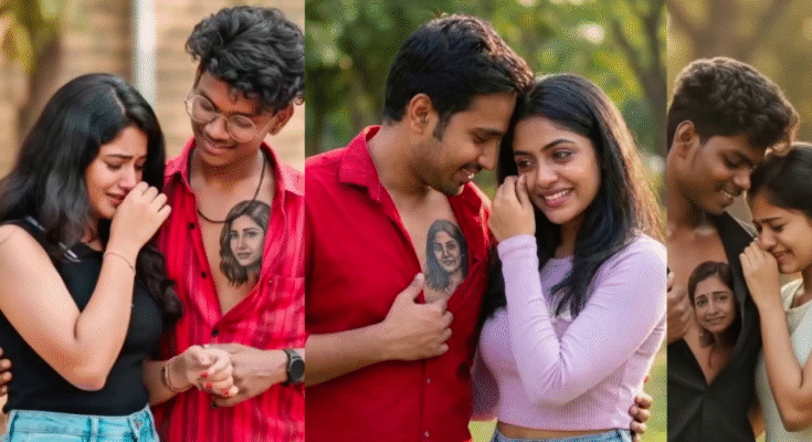“scene_description”: “A couple standing closely in an emotional moment. The man gently reveals a chest tattoo of the woman, while the woman cries happily and wipes her tears.”,