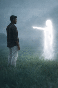 A cinematic wide shot of a young man standing in a green grassy field under a foggy, overcast sky. The man is positioned on the left side of the frame, facing right. He has short dark hair, a trimmed beard, and is wearing a dark Brown plaid shirt and white pants. He stands still with a serious, calm expression, looking straight ahead. In front of him, on the right side, there is a glowing white humanoid figure made entirely of bright light. The figure appears slightly feminine in shape and is semi-transparent with soft radiant edges. It is pointing directly at the man with one extended arm. The glowing figure emits a strong white aura that slightly illuminates the surrounding mist. The atmosphere is moody and surreal, with soft fog blending into the horizon. The grass is lush and slightly blurred in the foreground. The sky is gray-blue and hazy, creating a mysterious, dreamlike environment. Cinematic lighting, shallow depth of field, ultra-realistic, high detail, dramatic composition, 4K resolution.